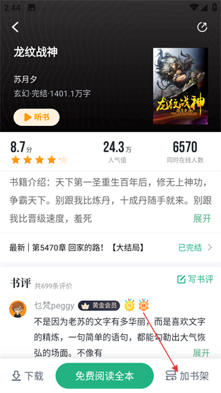 4、在龙纹战神详情页面,点击加书架,将书籍加入书架。
