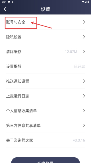 3、在设置界面,点击账号与安全选项,进入账号安全页面。