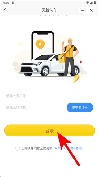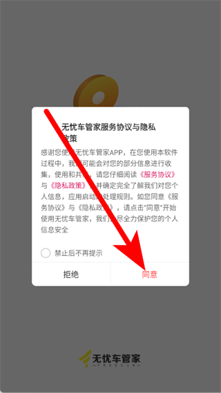 1、打开无忧车管家,在提示页点击同意。