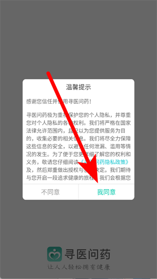 1、打开寻医问药,在温馨提示页面点击我同意。