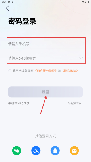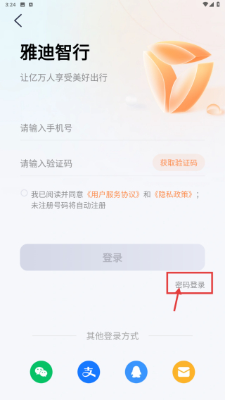 3、在登录选项界面,选择密码登录模式,输入手机号和密码。
