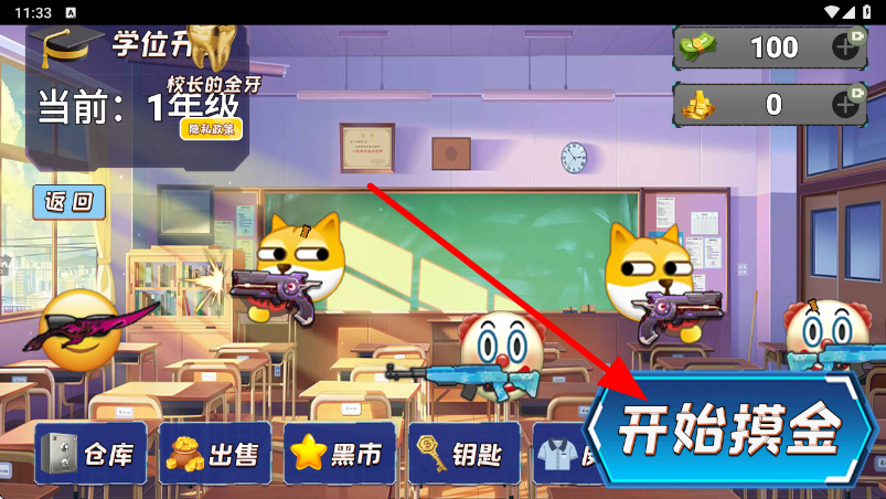 1、首先进入游戏界面,点击开始摸金按钮,开启在校园的摸金之旅,进入校园场景,准备探索收集物品。