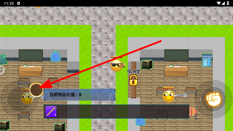 3、玩家可以点击右侧的拳头按钮,与相关物品或场景敌人进行攻击,比如在教室里,通过此操作击败敌方获取物品。