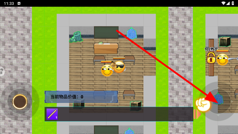 2、进入校园场景后,通过左侧的移动操控按钮,控制角色在校园的各个教室等区域移动,寻找可收集的物品,推进摸金进程。