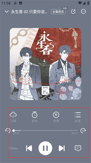 4、在有声书播放页面,可使用下载等功能进行听书。