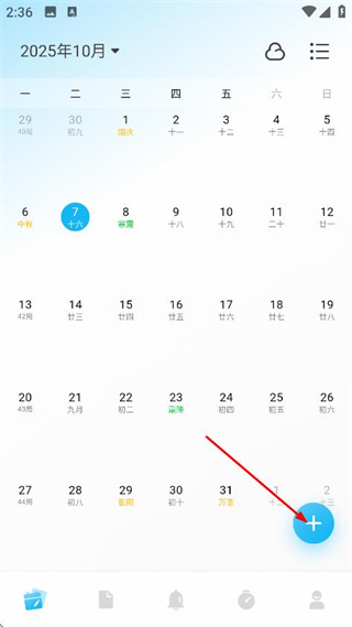 1、在日历界面,点击右下角的+符号,进入内容编辑页面。