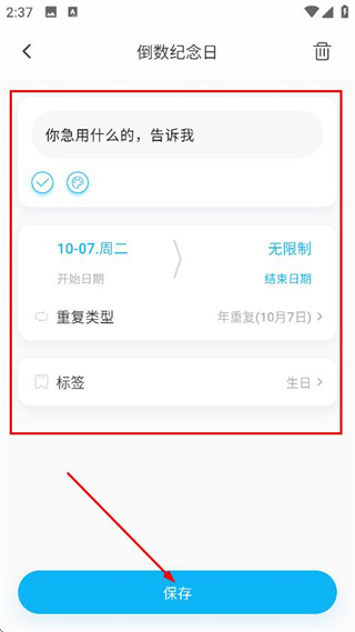 3、在设置页面,确认内容和相关设置后,点击保存,完成倒数纪念日设置。