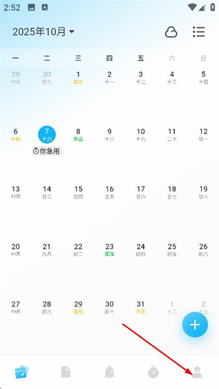 1、在日历界面,点击右下角小人图标,进入个人相关页面。