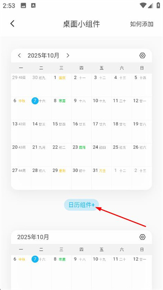 3、在桌面小组件页面,点击日历组件+,可进行日历组件相关操作。