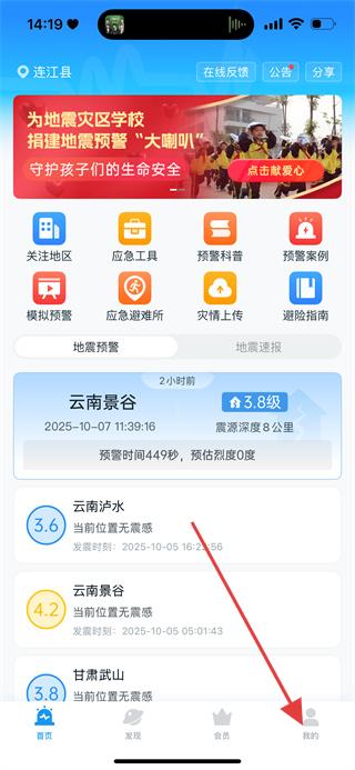 1、在地震预警首页,点击底部我的,进入个人相关页面。