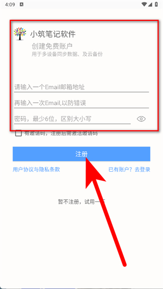 4、在注册页面,依次输入Email邮箱地址,注册后需激活邀请码选项,点击注册,完成账号注册。