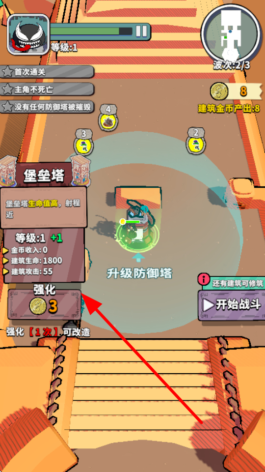 1、花费金币可对防御塔进行升级强化,强化后的防御塔生命值、攻击力等属性会提升,能更有效地抵御敌人进攻。