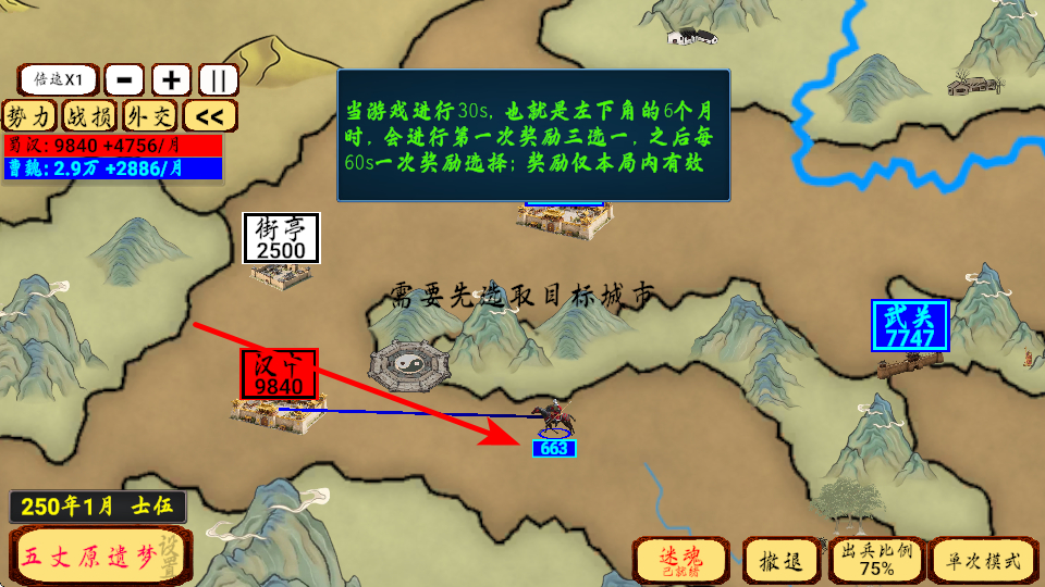 3、出兵前需先选取目标城市,根据敌我兵力对比如汉中9840 vs 敌方663,确保兵力优势后再行动,提高占领成功率。