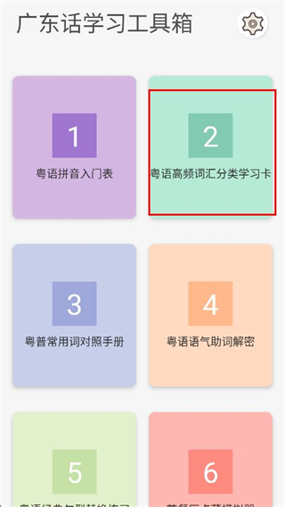 1、在学习工具箱页面,点击粤语高频词汇分类学习卡,进入分类学习卡页面。