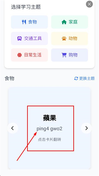 4、点击卡片,可翻转查看蘋果的粤语拼音ping4gwo2。