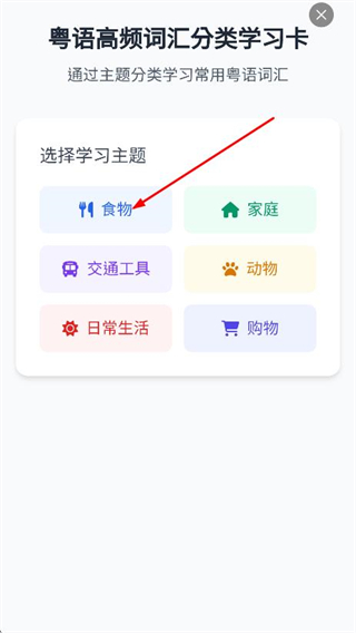 2、在粤语高频词汇分类学习卡页面,点击学习主题,进入该主题词汇学习页面。