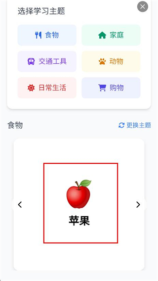 3、在主题词汇学习页面,可查看词汇苹果的相关展示。