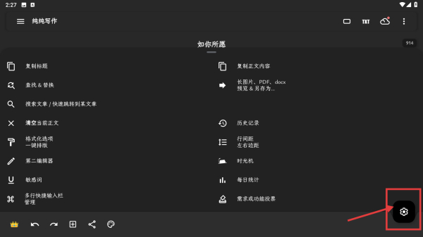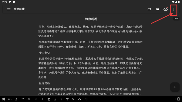 1、打开纯纯写作应用,点击右上角三点菜单按钮,展开功能菜单。
