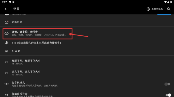 3、在设置页面,点击备份、云备份、云同步选项,进入备份同步设置页面。