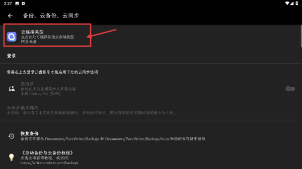 4、在备份同步设置页面,点击云选择类型选项,可选择并配置云存储类型进行备份同步操作。