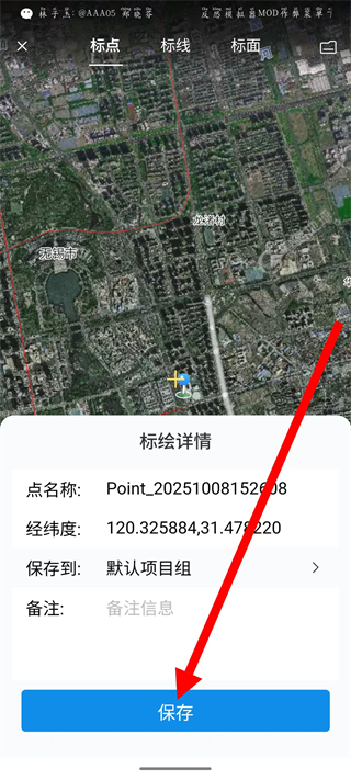4、在弹出的标绘详情框中,点击保存按钮,完成点位标记的保存。