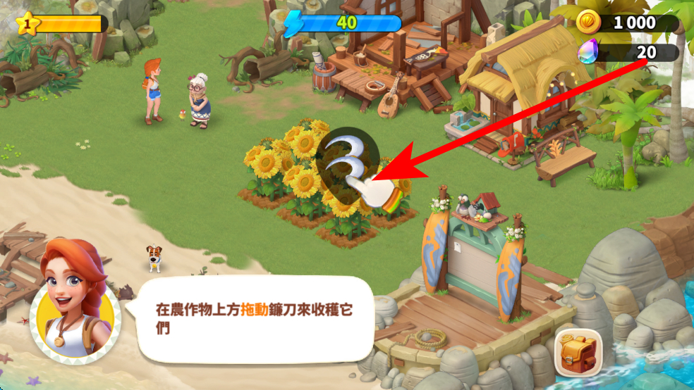 2、收获时,需在成熟的农作物上方拖动镰刀,就能收取它们,像图中成熟的向日葵,这样操作可获得作物资源。