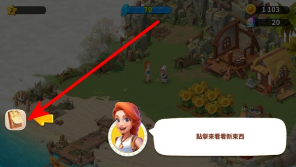 4、当游戏中有新物品出现时,界面上通常会有相应提示,比如像图片中箭头所指的带有黄色提示角标的图标,这就意味着有新东西可以查看。