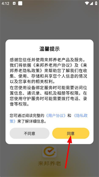 1、在温馨提示弹窗中,点击同意,进入登录注册页面。