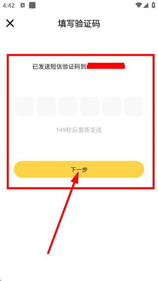 4、在填写验证码页面,输入收到的验证码后,点击下一步,完成注册流程。