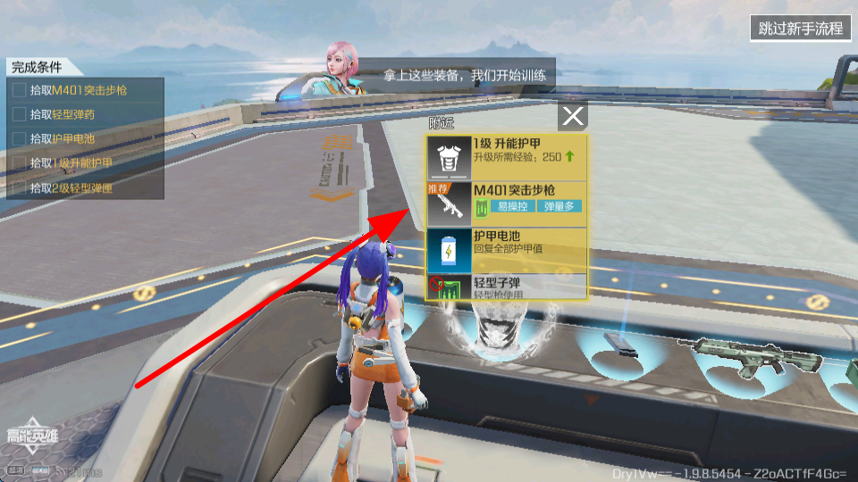 3、装备拾取,如M401突击步枪、轻型子弹、护甲电池等,靠近这些装备并进行拾取,为后续战斗做准备。