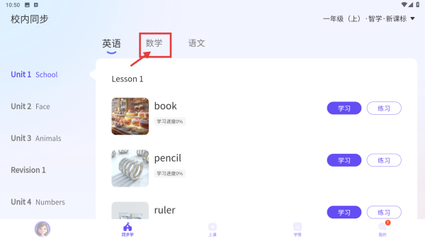 2、在校内同步页面,点击数学科目选项,切换到数学学习板块。