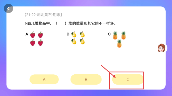 4、在题目练习中,分析各选项数量:A堆有4个草莓,B堆有4个梨,C堆有3个菠萝,因此数量不同的是C堆,选择答案C。