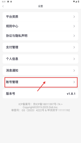 3、在设置界面,点击账号管理选项,进入账号管理页面。