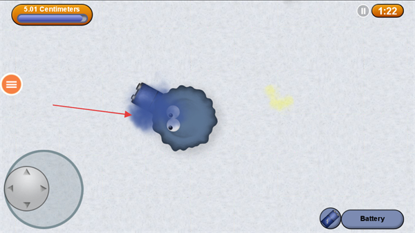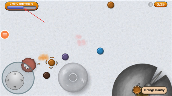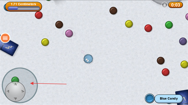 1、使用左下角虚拟摇杆操控蓝色小球移动,收集彩色糖果,留意上方进度条1.71Centimeters。