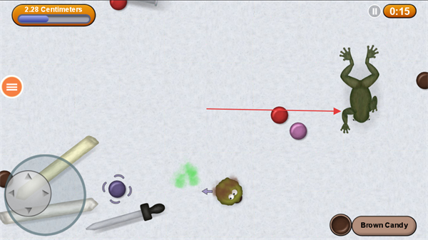 2、随着小球变大,可吞噬青蛙等小型物体,注意右上角时间0:15,快速积累体积。