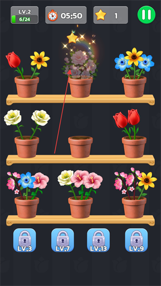 1、留意屏幕上方等级LV.2、倒计时05:50和星星数量,找到三朵相同花朵进行合成获取星星。