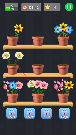 初期关卡仅需简单三花连线,后续逐步加入“固定花朵”“多色搭配”等限制,难度缓慢提升,避免新手因挑战过高而放弃。
