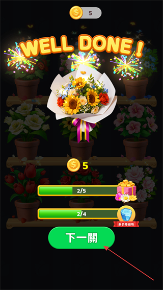 4、当进度条达到要求,且获得足够星星完成关卡目标,点击下一關进入下一关游戏。