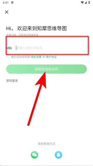 3、在登录页面,输入手机号,勾选后点击获取短信验证码。