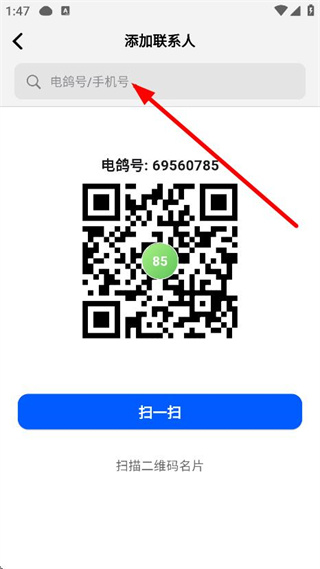3、在添加联系人页面,点击电鸽号手机号搜索框,进入搜索页面。