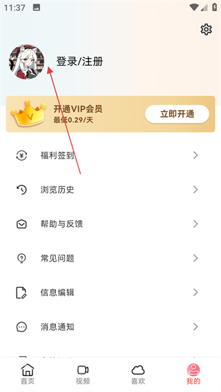 2、在个人页面,点击登录注册,进入登录注册页面。