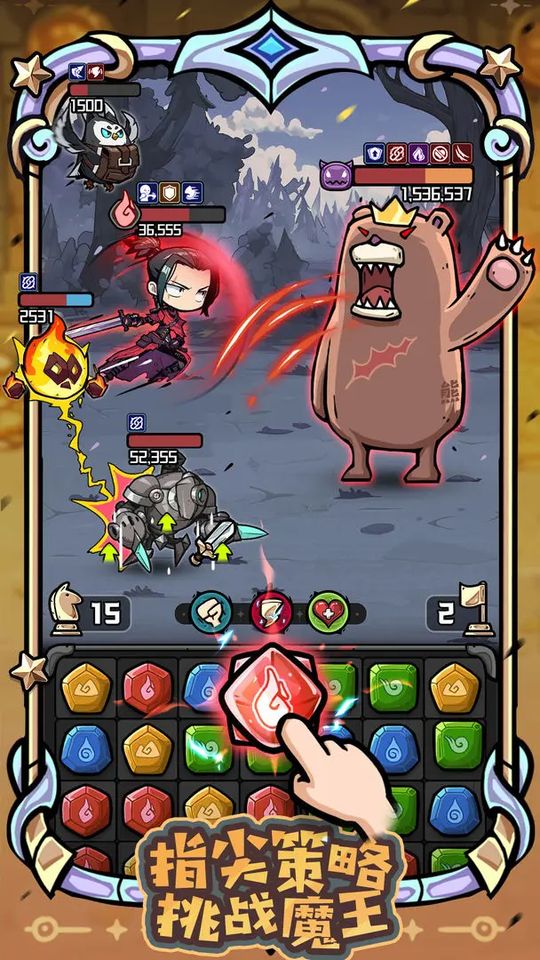 2、当成功将同色宝石连成一排后,会自动对敌人发起攻击,对敌人造成伤害,推动战斗进程。
