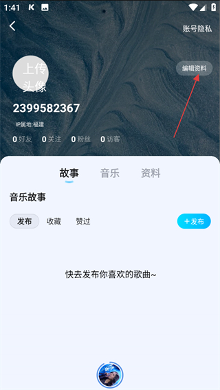 3、在个人资料页面,点击编辑资料,进入编辑资料页面。