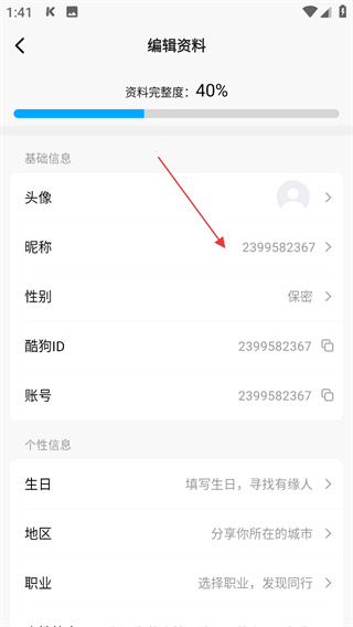 4、在编辑资料页面,点击昵称,进入昵称编辑页面。