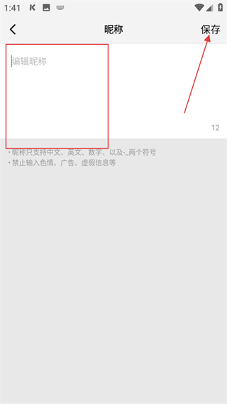5、在昵称编辑页面,输入新昵称后,点击保存,完成昵称修改。