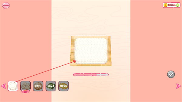 1、进入游戏,点击下方食材栏中的海苔,放置到竹帘上开始制作寿司。