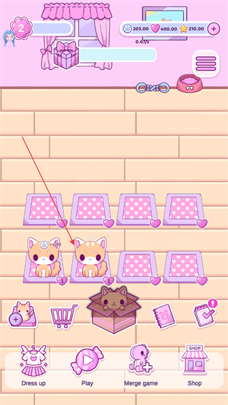 1、进入游戏界面,看到粉色温馨场景,留意上方进度条及金钱数值203.00等。