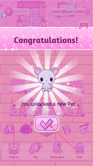 4、成功解锁新宠物后,出现Congratulations!提示,点击对勾图标确认。