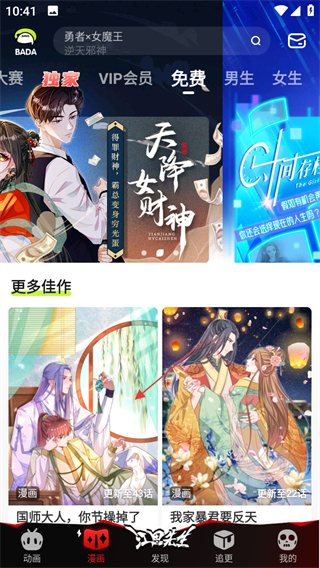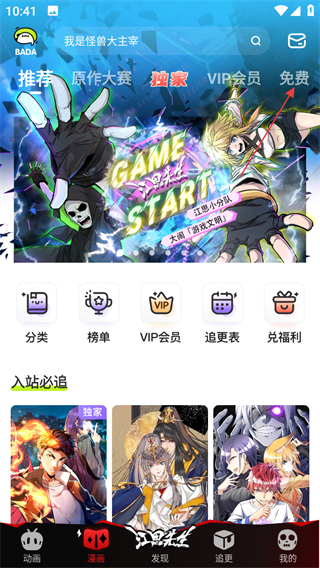 2、在漫画页面,点击顶部免费标签,进入免费漫画列表页面。
