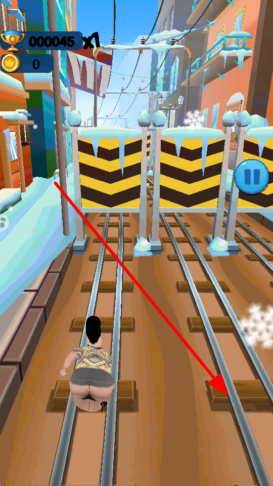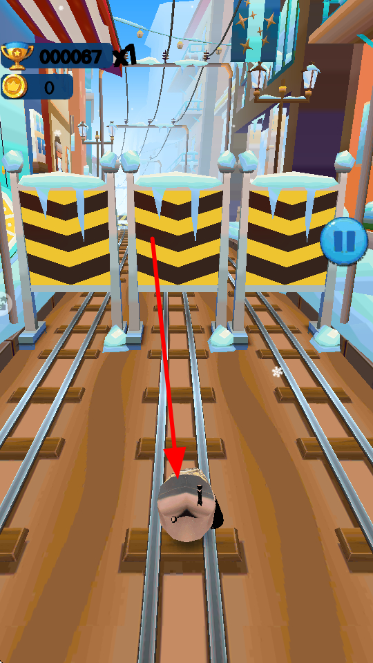 1、左右滑动屏幕,操控角色在轨道间移动,躲避障碍物,同时寻找获取金币的机会。
